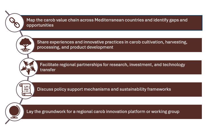 Given the urgent need to strengthen and better structure the carob value chain, Carob Days’ main goal is to connect stakeholders across the value chain - from growers and harvesters to traders, processors, researchers, and industrial users - toward a shared vision for innovation, value addition, and sustainable commercialisation, fostering knowledge exchange and development of innovative practices, so the benefits are shared across all links in the chain.