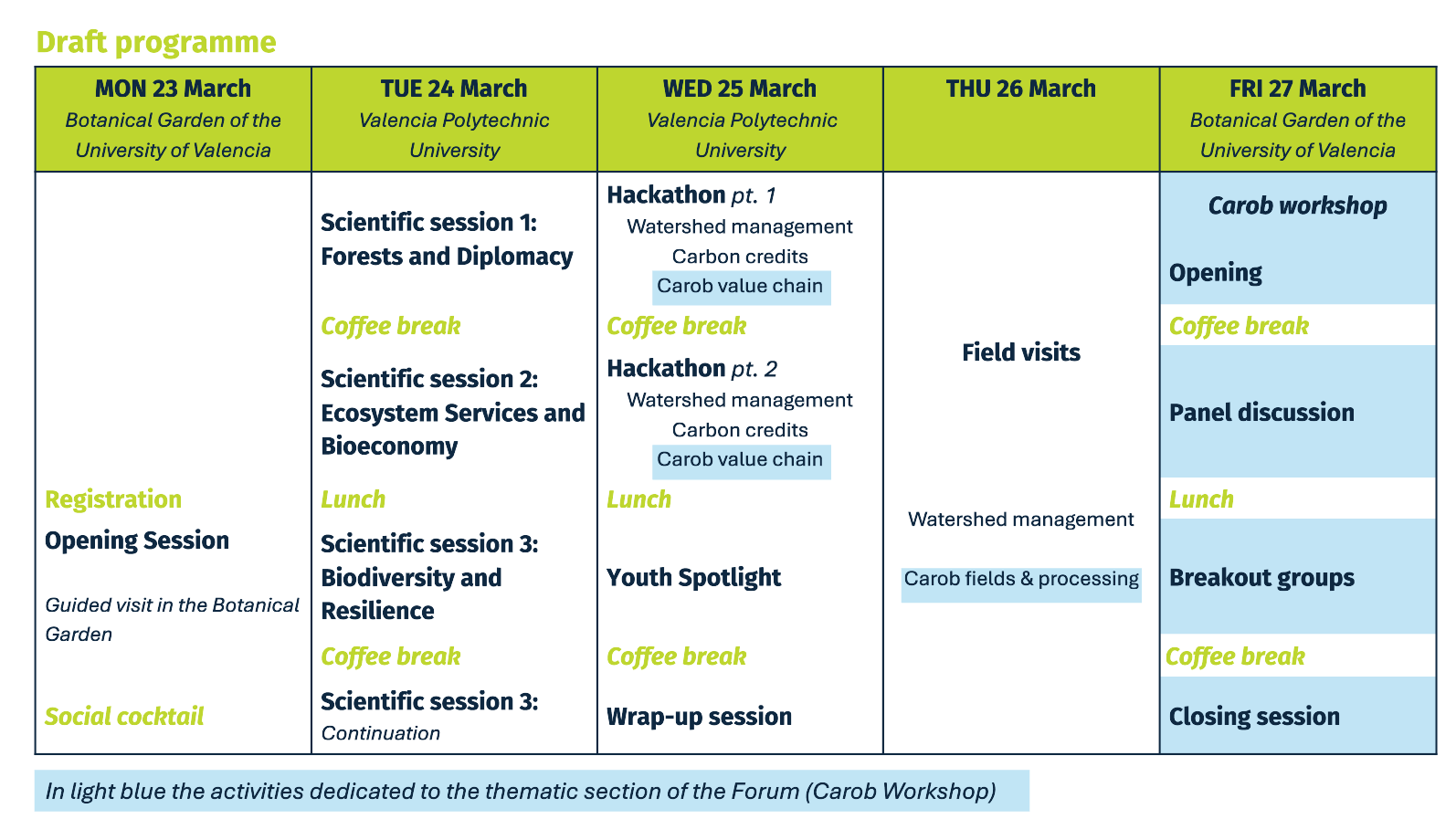 The Carob Days is a thematic workshop taking place during the Mediterranean Network Forum, between 25–27 March, in Valencia, Spain. It will highlight the carob’s (Ceratonia siliqua) ecological, cultural, and economic importance across the Mediterranean, as well as its role in agroforestry, conservation, and sustainable value-chain development.