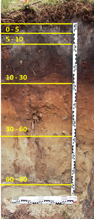 Forest soils and especially forest floors vary within centimetres, horizontally and vertically (Muukkonen et al. 2009). For that reason, the sampling design should consider the small-scale heterogeneity through sampling at a minimum of 5 samples per depth. Soils vary also considerably with depth, because soil development leads to different horizons with different properties. For this reason, soils sampling should consider sampling strategies that provide samples from different soil depths (e.g. 0-5cm,10-30cm, 60-90cm). (Fig. 5)