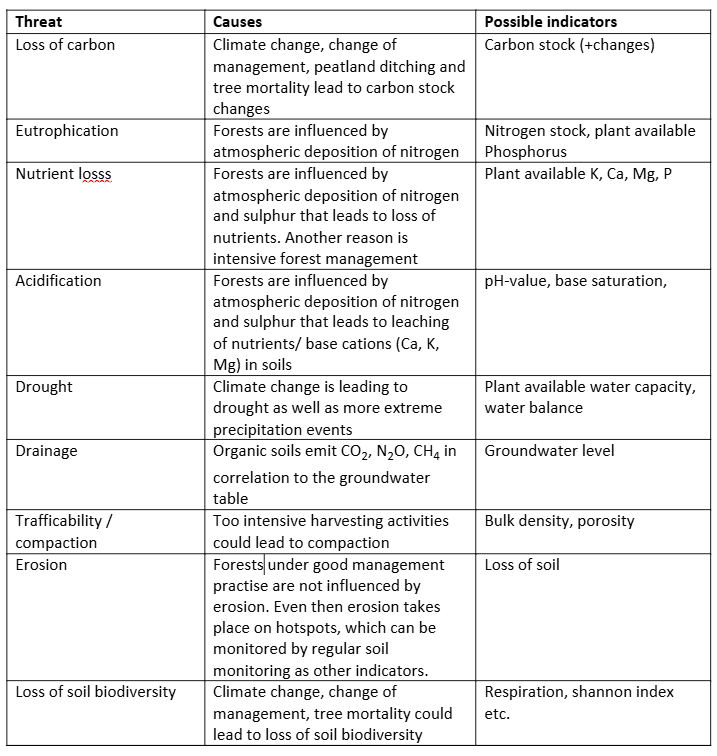 Due to soil and forest management, pollution or climate change, the function of soils can be impaired or lost completely. Those threats and potential changes can be monitored with the help of a set of different indicators that are listed below: