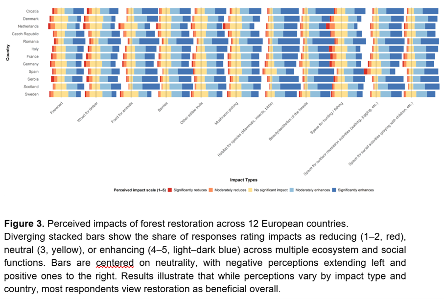 Perceptions of restoration impacts varied across the 12 countries and benefit types (Figure 3). While some respondents viewed restoration as having negative effects, especially on resource-use benefits such as firewood, timber, and hunting space, this pattern was not consistent across all regions. Habitat quality, species diversity, and recreational opportunities were more often perceived as positively affected. Overall, restoration was broadly seen as beneficial, though not uniformly so, highlighting how local experiences and livelihood connections shape public understanding of restoration outcomes across Europe (see also Kazungu et al. 2025).