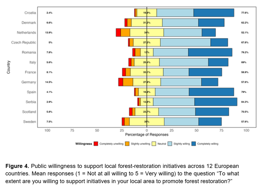 Overall, respondents across all 12 countries expressed a clear willingness to support forest restoration. However, levels of support varied considerably between regions with Eastern Europe showing strongest, Western and Southern Europe intermediate, and Northern and Central Europe lowest support for forest restoration (Figure 4). This suggests the need for more targeted engagement and communication strategies in Central and Northern areas to strengthen public understanding and commitment to restoration initiatives.